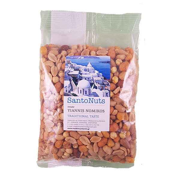 「サントナッツ(Santo Nuts)」はサントリーニ島の定番お土産で、ピーナッツやピスタチオなどのナッツ類をハチミツ・キャラメル・塩などさまざまなフレーバーで加工したものです。試食できる店舗も多く、日本人の口に合う味が見つかりやすいです。1袋1kgサイズのものもあり、職場へのバラマキ土産として非常に人気があります。