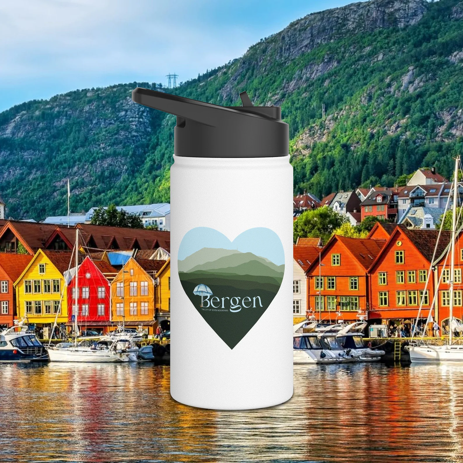 ベルゲンの7つの山々をデザインしたステンレス製ウォーターボトルで、5000〜6000円。Etsyストア(ベルゲン)で購入可能です。