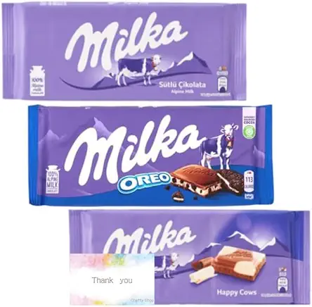 ミルカは紫色のパッケージが目印のヨーロッパで広く愛されるチョコレートブランドで、フランクフルト空港でも定番のお土産として販売されています。ミルクチョコレートをベースに、オレオクッキー入り、ストロベリークリーム、キャラメル味など多様なフレーバーが揃っており、免税店で手軽に購入できます。