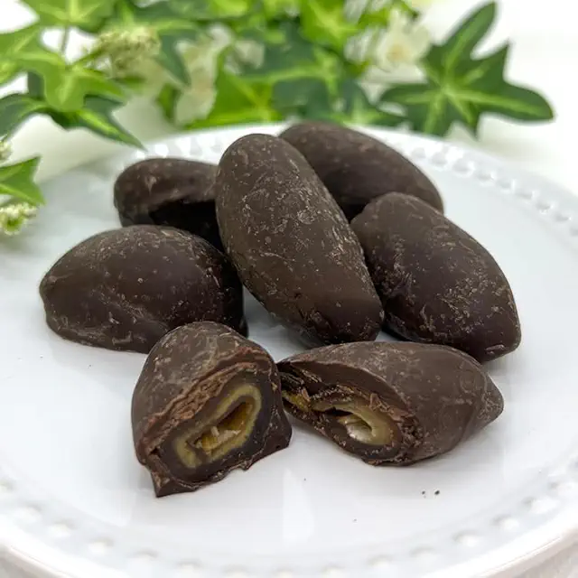 チョコデーツはドバイの大定番お土産で、中東特産のナツメヤシの実デーツにチョコレートとナッツを組み合わせたお菓子です。デーツ自体は異国感たっぷりの食べもので、人によっては好き嫌いが分かれますが、チョコをかけてナッツを入れると日本人にも食べやすい味に変身します。