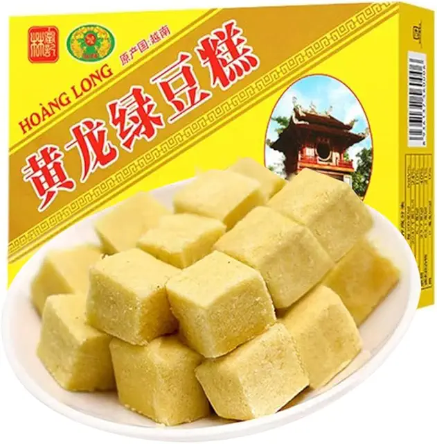 緑豆を粉末状にし、砂糖などと一緒にキューブ状に固めたシンプルなお菓子で、口に入れた途端にほろっと崩れる食感が特徴です。有名なブランドにはグエンフオン(Nguyen Huong)、ホアアン(Hoa An)、ゾンヴァン(Rong Vang)などがあります。グエンフオンの緑豆ケーキは歴史が古く、他ブランドよりも濃厚で甘い味わいで多くの人に購入されています。